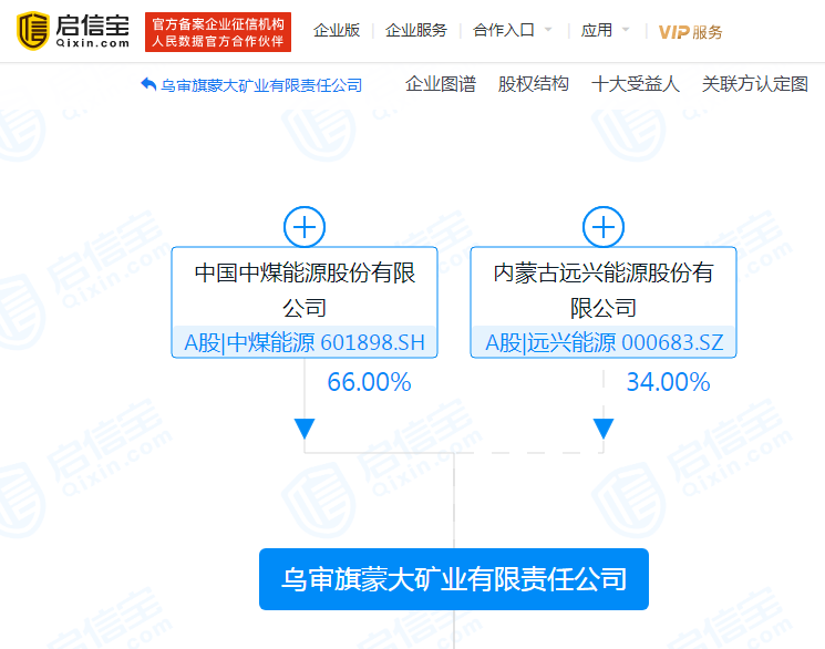启信宝显示,蒙大矿业成立于2007年,现注册资本为8.54亿元,由中煤能源持股66%,远兴能源持股34%。