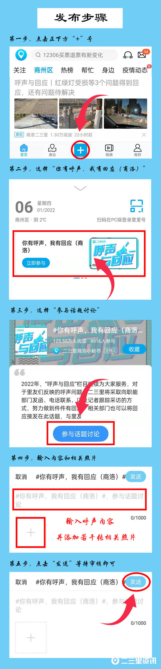 如果您身边有一些需要帮助的问题,可以通过下载二三里,输入邀请码,参与#你有呼声,我有回应(商洛)#话题,发布身边反映,具体操作步骤如下: