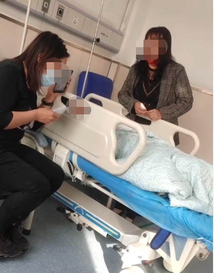 在神木市人民医院急诊室内,15岁的小冯躺在病床上,母亲袁女士坐在一旁焦急的看着儿子小冯。
