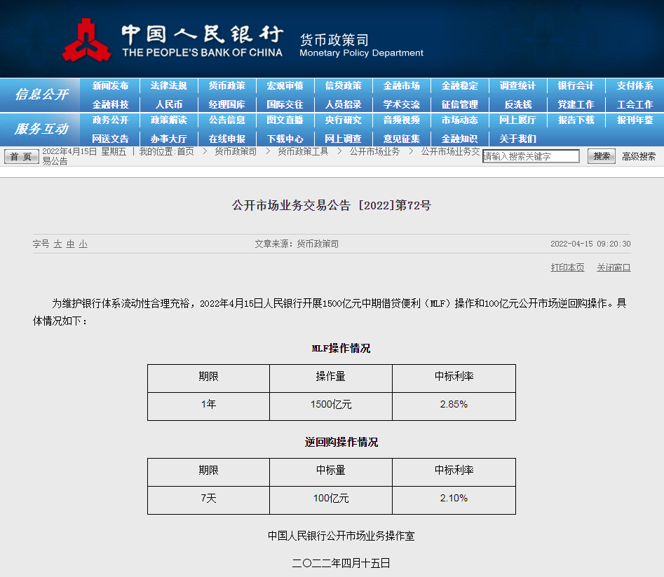 人民银行4月15日公告称,为维护银行体系流动性合理充裕,2022年4月15日人民银行开展1500亿元中期借贷便利(MLF)操作和100亿元公开市场逆回购操作。具体情况如下:
