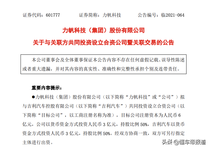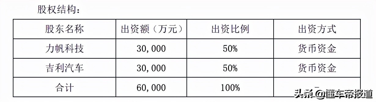 按照规划,目标公司注册资本为人民币6亿元,其中力帆科技以货币资金方式出资人民币3亿元,持股比例50%,吉利汽车以货币资金方式出资人民币3亿元,持股比例50%。公告中还明确,“经双方协商一致,双方可另行指定主体进行出资。”