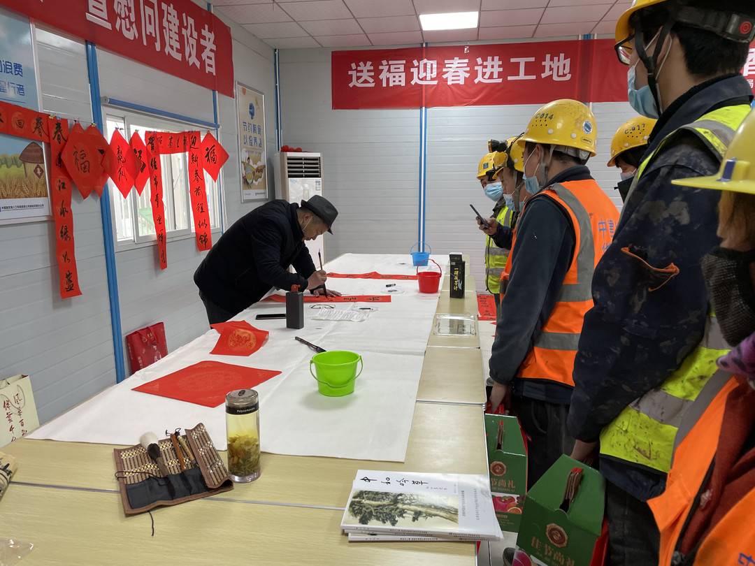 封面新闻记者获悉,1月1日,2022年元旦节第一天,中建八局西南公司基础设施分公司邀请成都市高新区乡情国画院书法老师走进成都环城生态综合修复项目部开展“送福迎春进工地,丹墨飘香暖人心” 为主题的送“福”活动,为即将返乡 “过大年”的施工一线建设者们写春联、送“福”字,现场气氛热烈,到处洋溢着浓郁的年味儿。