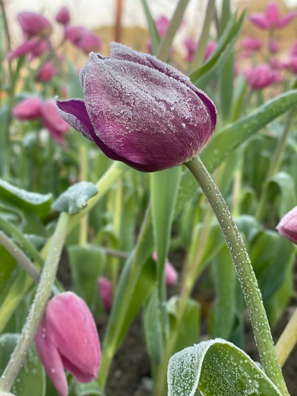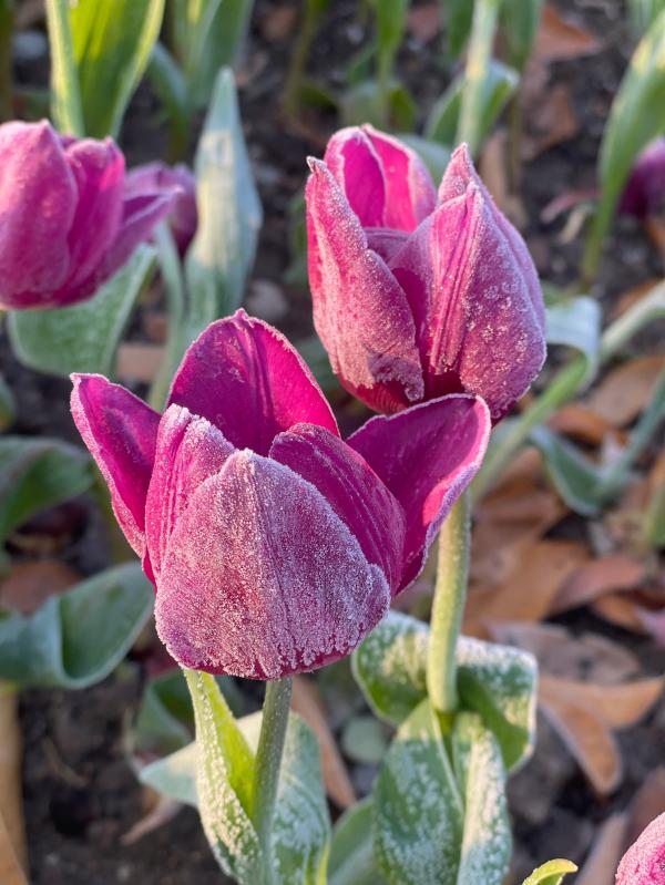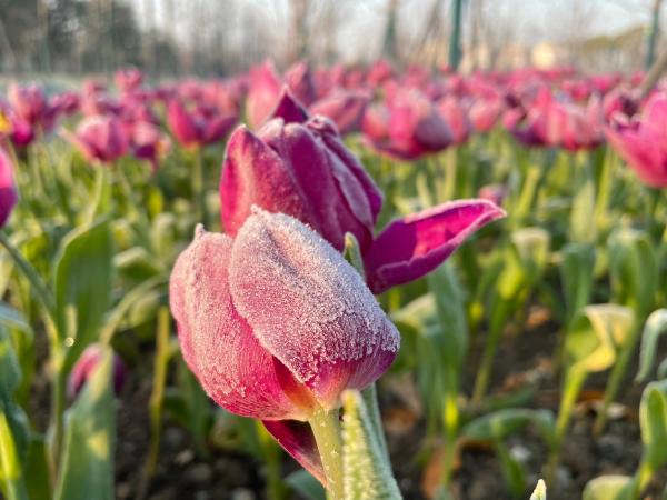 “凌寒独自开”的不一定只有梅花,还可能是郁金香。在新近开园的上海世博文化公园(北区)内,大片反季郁金香姹紫嫣红、迎风怒放,有些花朵、茎叶上还挂着白霜,成为园内一道亮丽风景线,不少市民对着这些郁金香拍照打卡。